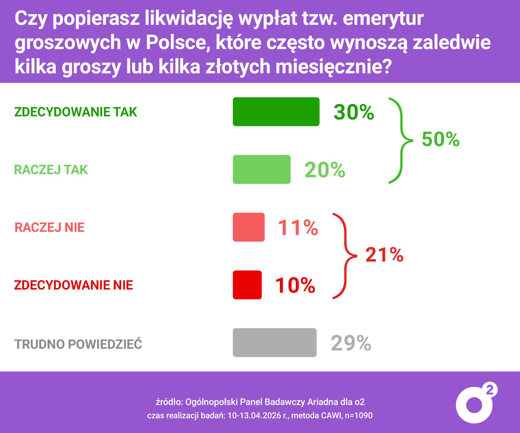 Jak wynika z badania ogólnopolskiego panelu Ariadna na zlecenie o2.pl, aż 50 proc. badanych opowiada się za zniesieniem tzw. emerytur groszowych, z czego 30 proc. badanych deklaruje, że popiera to rozwiązanie w sposób zdecydowany ("zdecydowanie tak"), a 20 proc. wybrało opcję "raczej tak".